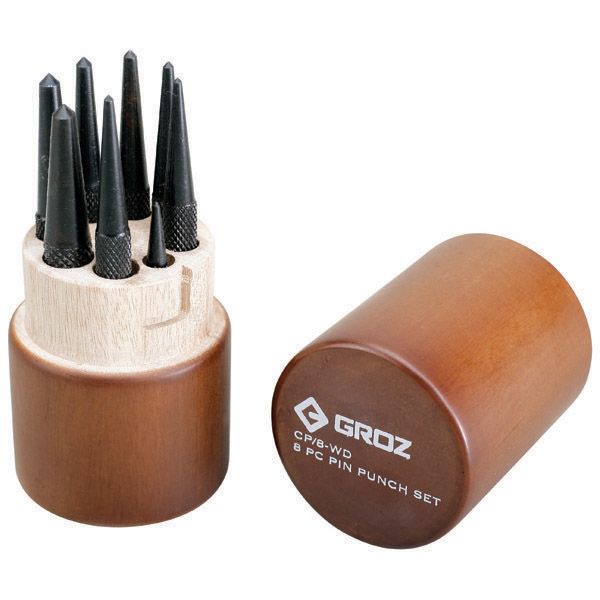 CP/8/WD/ST GROZ CENTRE PUNCH SET, IN ROUND WOODEN CASE, 8 PCE