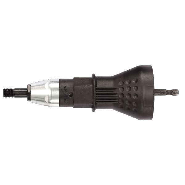 Rivet nut adaptor with 1/4" Hex Shank for use with 3/8" 12V, 14.4V & 18V cordless drills.