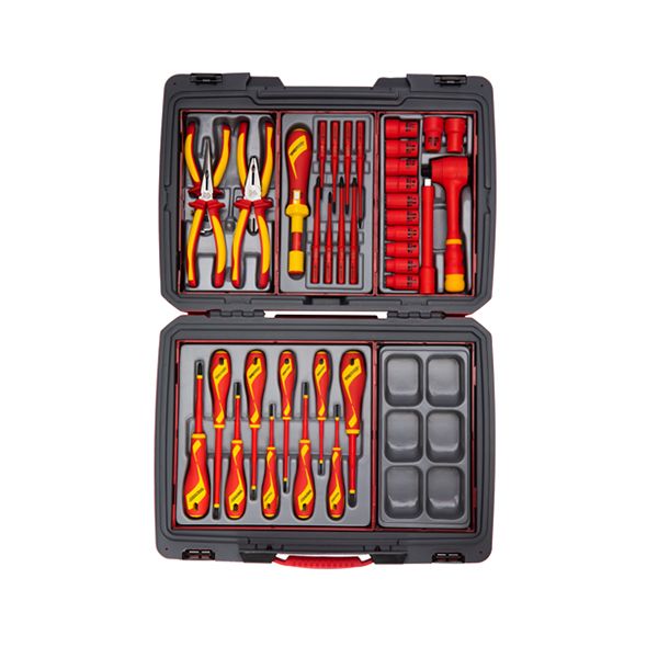 - Includes pliers, torque screwdriver, socket set 3/8" drive and screwdrivers